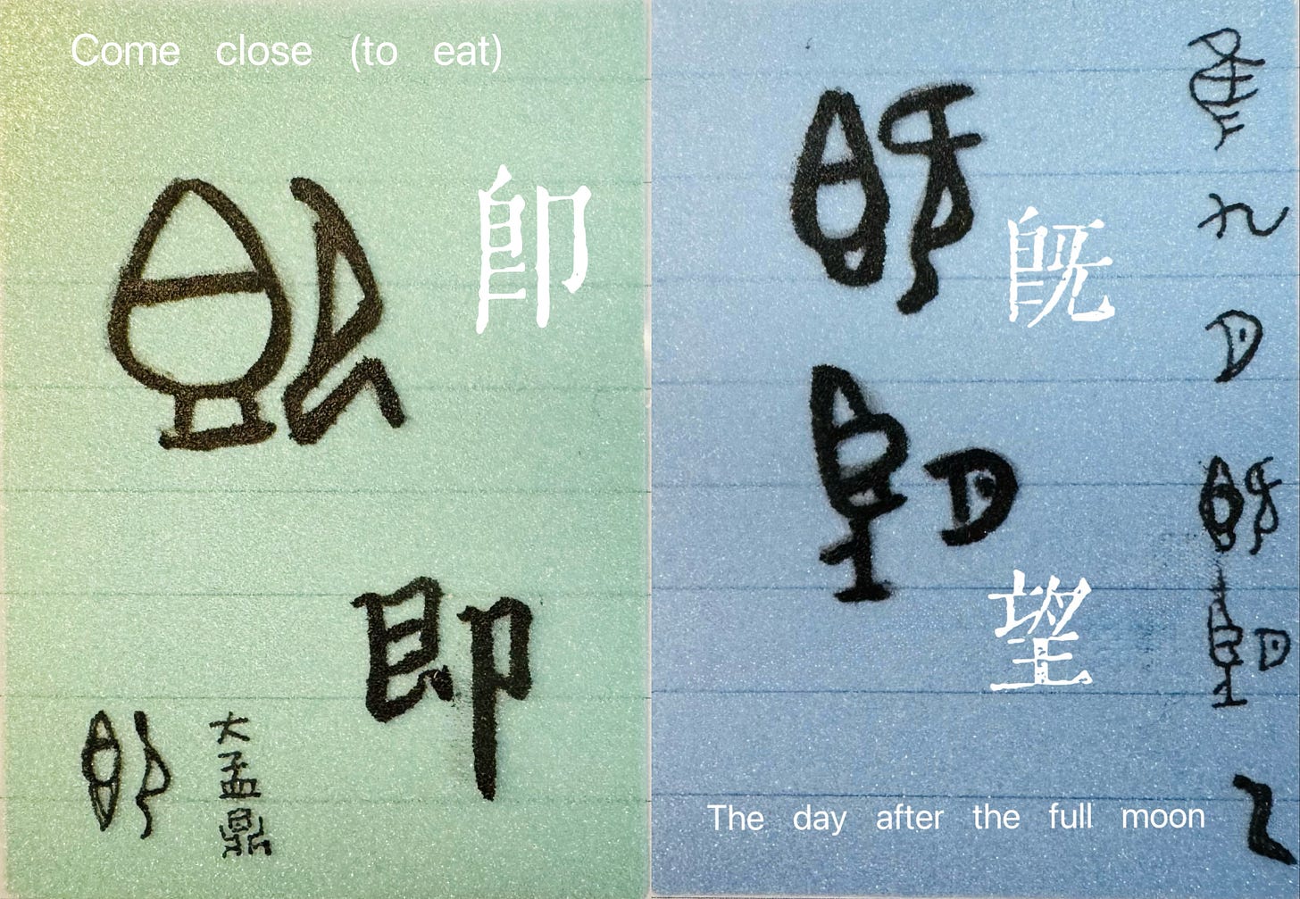 A cooking vessel on the left, steam rising from its opening (they would have been drawn in if they could but dots in oracle bone2 pictures are mostly used to describe blood); a kneeling person right next to it, facing away. It’s been interpreted as the person has completed the meal and perhaps having a quiet burp. 既 means finished, completed. Though I always thought of it as the meal is ready to serve and the person is turning around calling the family to come and join in. More delicious this way.