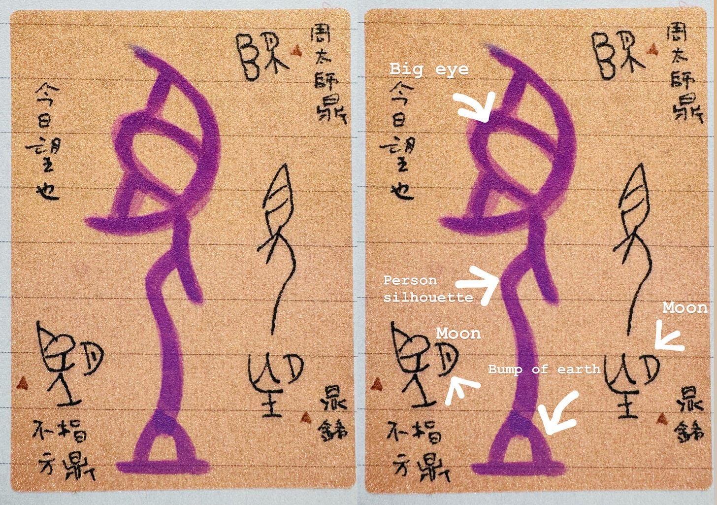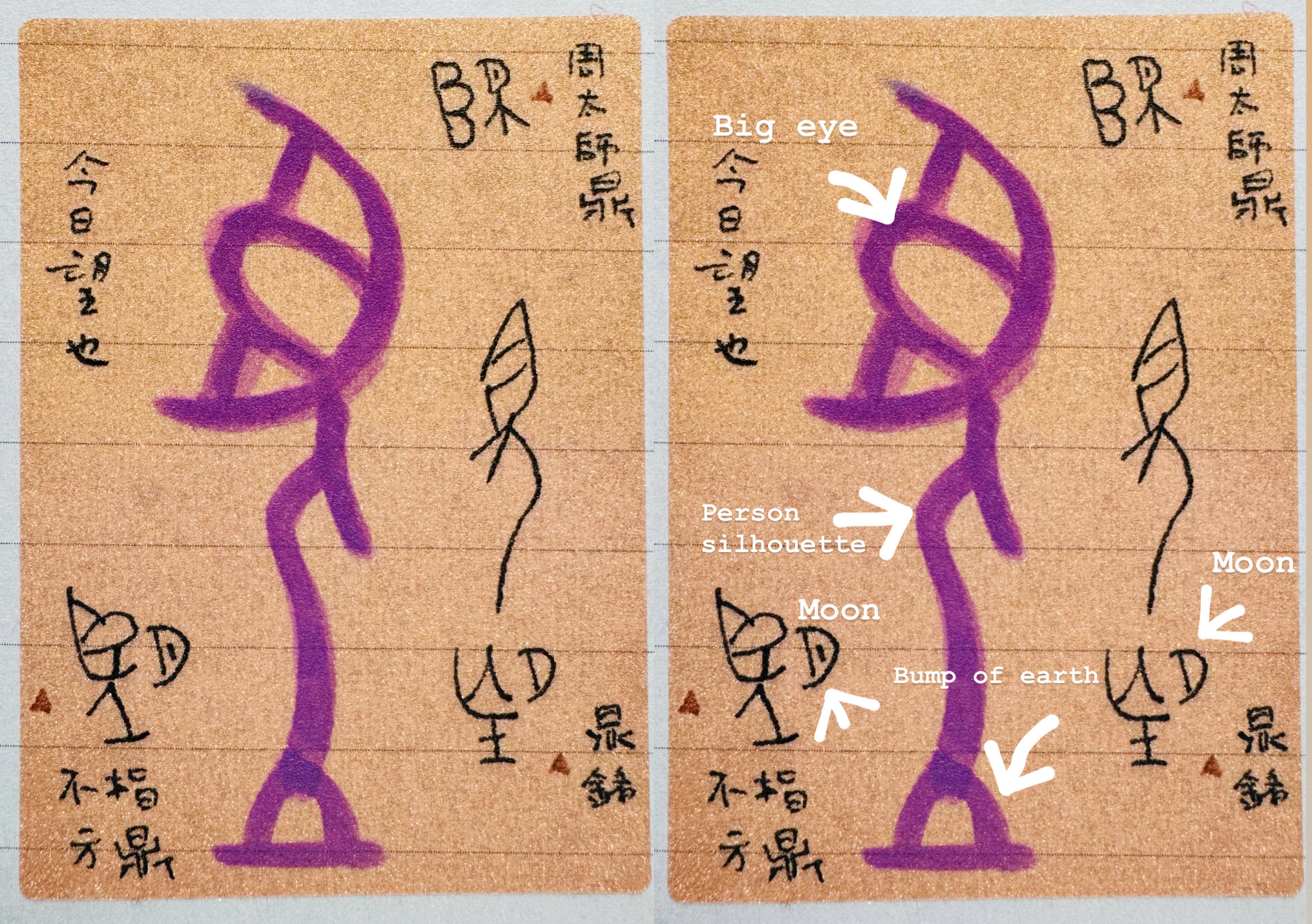 The character in purple and the one on its right are in the Oracle Bone Script. See if you can spot all the moon parts in the bronze script characters in the picture?